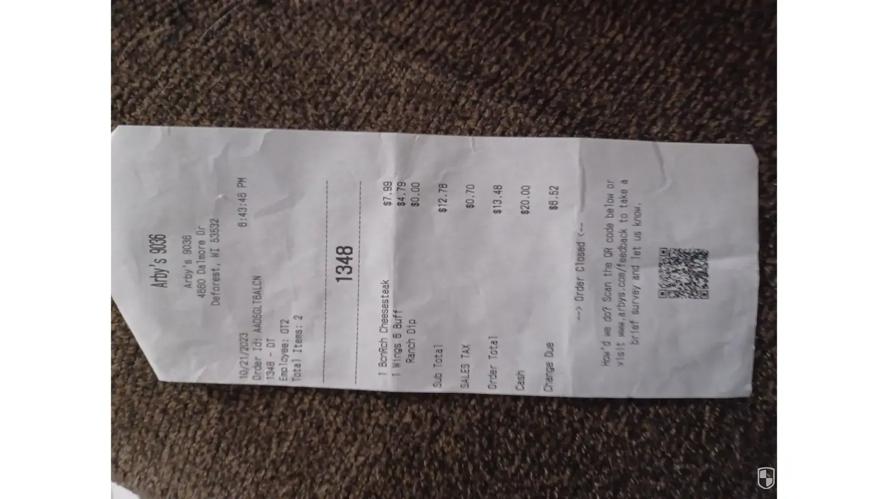 I was at arby's yesterday, , , , , , , ticket number101 at 8:17 p.m.order number120101 arbys in brooklyn Center MN.