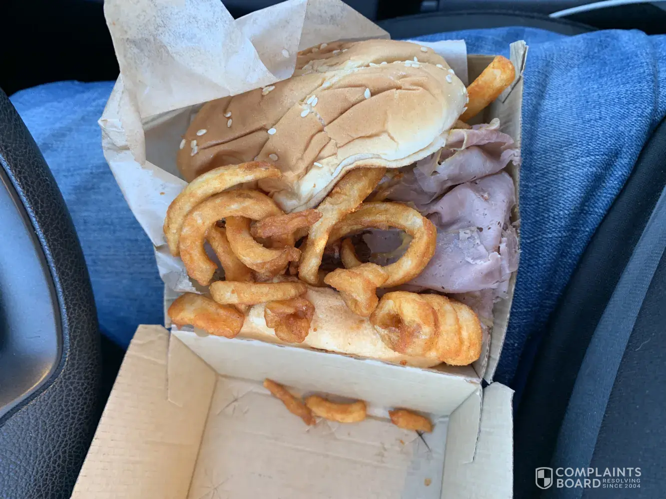 i ordered the new Arbynator sandwich in Drive thru. After I received my food I continued driving and then started to open my food. When I opened the box the sandwich was on its side and looked like stuff was just thrown together in the box. It was really sloppy with all the sauces in the bottom of the box. I will Have added a picture to show how it was before I moved everything to make it edible.