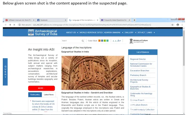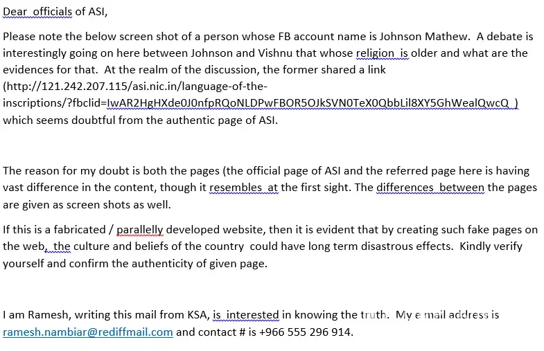 Please access the below given url which was appeared in one of the FB debates between two.Kindly confirm if the said material is an official posting of ASI. http://121.242.207.115/asi.nic.in/language-of-the-inscriptions/?fbclid=IwAR2HgHXde0J0nfpRQoNLDPwFBOR5OJkSVN0TeX0QbbLil8XY5GhWealQwcQ I have doubt on its integrity.