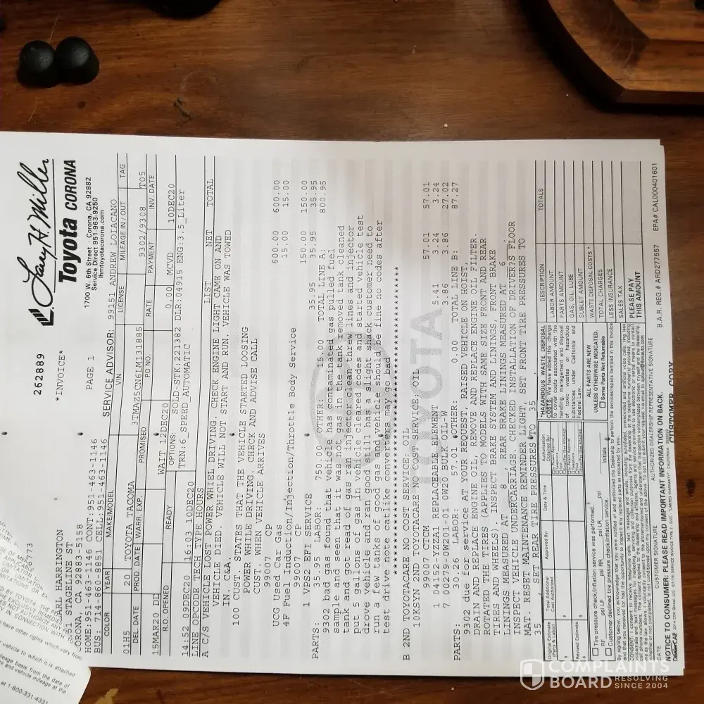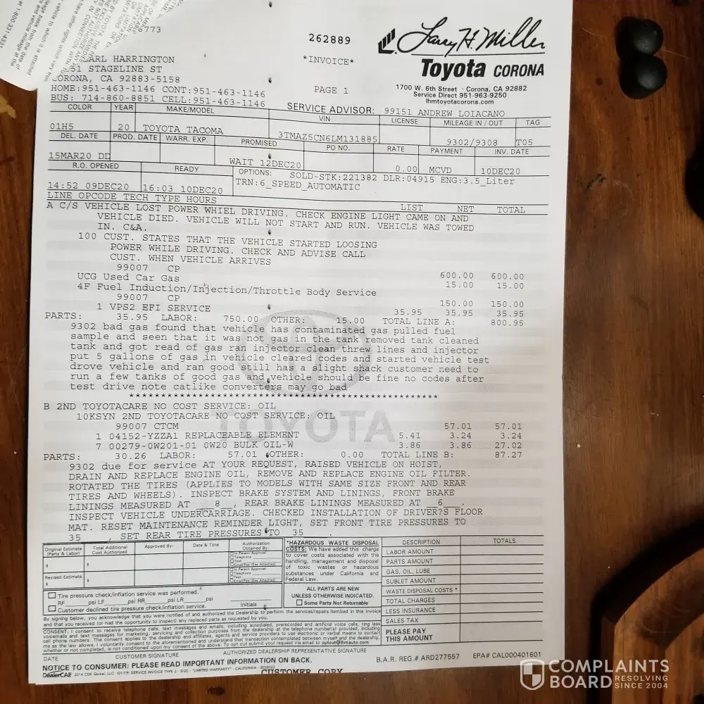 I have a 2020 Toyota Tacoma which I filled up with unleaded gas at an Arco gas station. It was not gas or properly mixed gas, my Truck died as soon as the old gas ran out. It cost me $900.00 dollars to take off the tank and flush the lines, and put new gas not at Arco. The chemical at pump #2 damaged my gas lines on the outside plus I was stuck for 6 hours on the road waiting for a tow truck. I have not heard back from Arco yet only twice they contacted me. My name is Rick Harrington at [protected]. The Gas station is located on Temescal Canyon in Corona Ca 23760