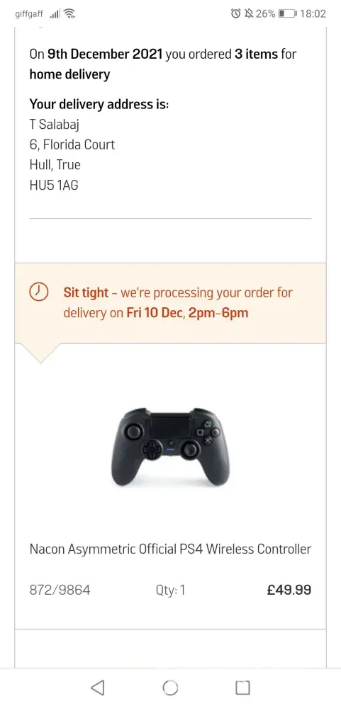 I purchased on the internet the £99 pamper day with a 55minute treatment on the 2nd of December for my wife Birthday on Saturday the 10th of December, I received a text that day saying that my order would be delivered with in 3 days, I then received a 2nd text on the Sunday the 4th saying I would receive my item with in 3 days,7 days later from purchase date I still have not received anything, I phoned on Thursday the 8th and spoke to one of your customer service agents who was very helpful and told me to wait to see if it arrived that day if it didn't phone back on the Friday and it would be escalated with with the delivery company, I phoned back and spoke to a different lady who's attitude leaves a lot to be desired, abrupt couldn't care less attitude, her answer to me was it comes from the manufactorors and is being delivered by Royal mail and they are having strike action, so she could not tell when I am likely to receive my item, I asked would it be this side of Christmas and she said I don't know with a cold careless attitude. these strikes have be going on for months so you would think that Argos would have an alternative plan for deliveries of internet sales. you were quick enough to take my money but have failed to deliver.