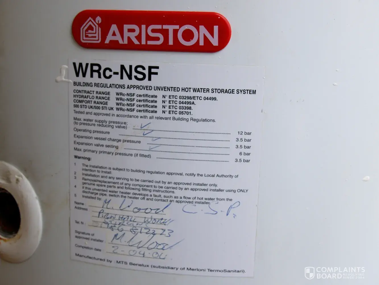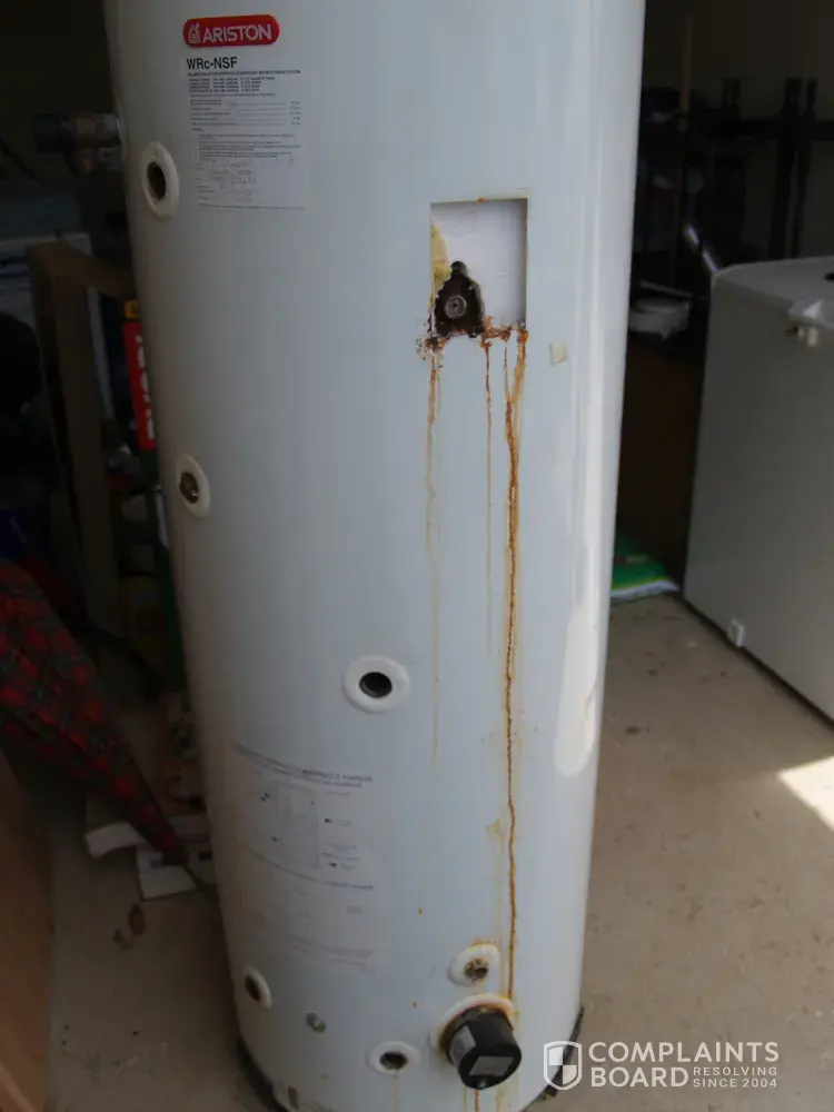 My complaint is that nowhere on the old hot water tank does it say that the tank needs servicing annually, and I had no instruction manual to say so. The hot water tank in my last house needed replacing after 30 years because of hard water, I have never heard of a hot water tank needing servicing. The tank has written over the box that corroded so badly 'Pro Tech anti-corrosion system' conveniently hiding the corrosion and my plumber said that the tank should have lasted at least 10 years. I wrote several times to Ariston, I said I had kept the tank for their engineers to inspect. They eventually sent a bog standard letter not addressing my grievance, I then sent photos and they replied by saying the tank should have been left in place for them to examine, ( that would have been a good winter with no hot water) they said there was nothing they could do and they enclosed an instruction print out for the hot water tank that had been replaced. I was astounded. I am a pensioner, I can ill afford the £1100 I have had to spend to replace the hot water tank that should have lasted at least 10 years, when in truth it barely lasted four and a half years. The least they could have done was to offer some sort of compensation. You do not expect to move into a brand new house with brand new equipment and to have to start replacing everything. Whatever you do don't buy Ariston!