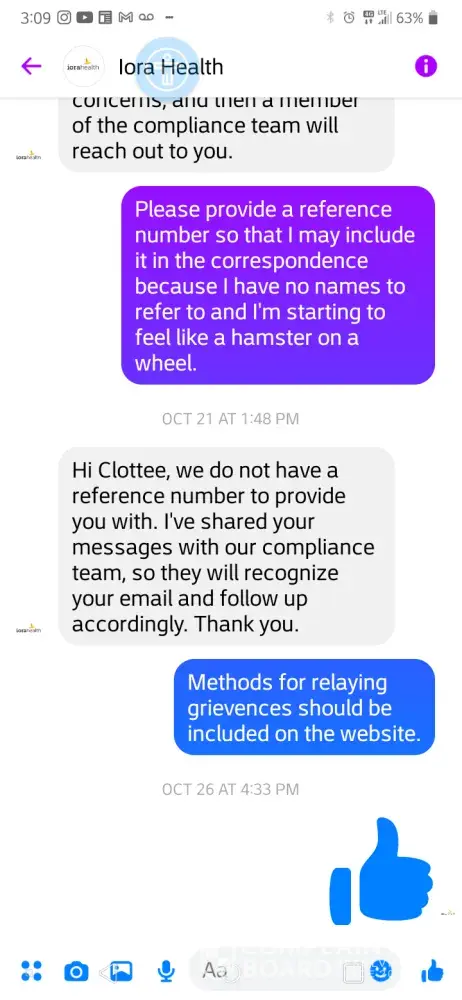 I later spoke with Ms. Darling's Director (Diane/no last name given), however it was clearly perfunctory. I was inquiring about how I might escalate my experiences and concerns; however a process of accountability was. I therefore reached out to Iora on Facebook Messenger and was advised to contact your office by the anonymous responder that answers inquiries on that platform. [Those messages have been downloaded. ]