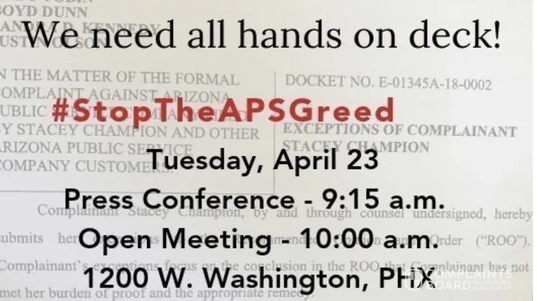 In January 2018, I filed a formal complaint about the unjust & unjustified rate hike that was approved in Aug. 2017. I crowdfunded the attorneys fees, secured an expert, had a 5 day hearing last September where we completely uncovered their shell game, and just got a ruling from the Judge saying the complaint should be dismissed. It is the ultimate David vs. Corporate Goliath battle, as it's me (us) against a multi billion $$$ utility monopoly. The AZ Corporation Commissioners (3 of whom APS spent millions to get elected - & 2 of the 3 who rubber stamped the rate hike). The Open Meeting on this issue before the Commissioners is THIS TUESDAY and I need all hands on deck! If you have been negatively affected by APS I need your voice! If you can't make it in person, you can call in. If you can't call in, I need to to email the Commissioners as well as file all of these complaints into our Docket. It's going to take all of us to topple Goliath and #StopTheAPSGreed! Here are the details for Tuesday, April 23: https://www.facebook.com/events/997959993736589/?ti=ia