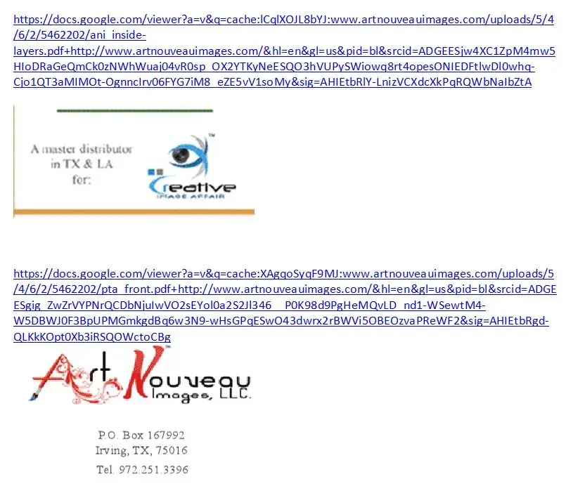 Art Nouveau Images operated from 2010 to 2012 as a Master Distributor in Texas & Louisiana for Creative Image Affair in Minnesota