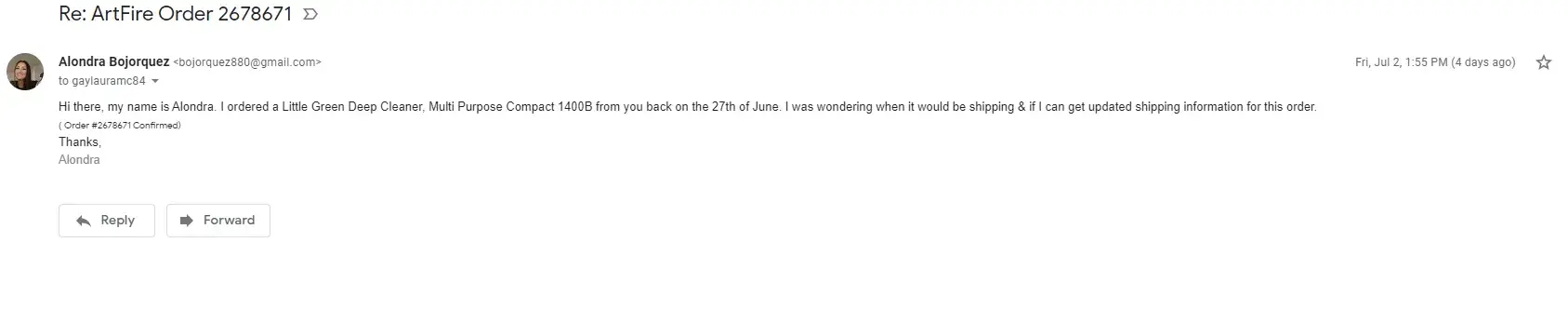 "Hi there, my name is Alondra. I ordered a Little Green Deep Cleaner, Multi Purpose Compact 1400B from you back on the 27th of June. I was wondering when it would be shipping & if I can get updated shipping information for this order.