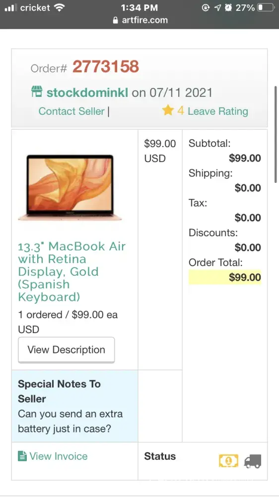 I ordered the laptop with the order number on the picture attached to this on July 11th here it is July 20th and still haven't heard back the seller removed his page as well. I have not heard back from the seller or customer service about the product I bought. And the price was $99 on artfire.com