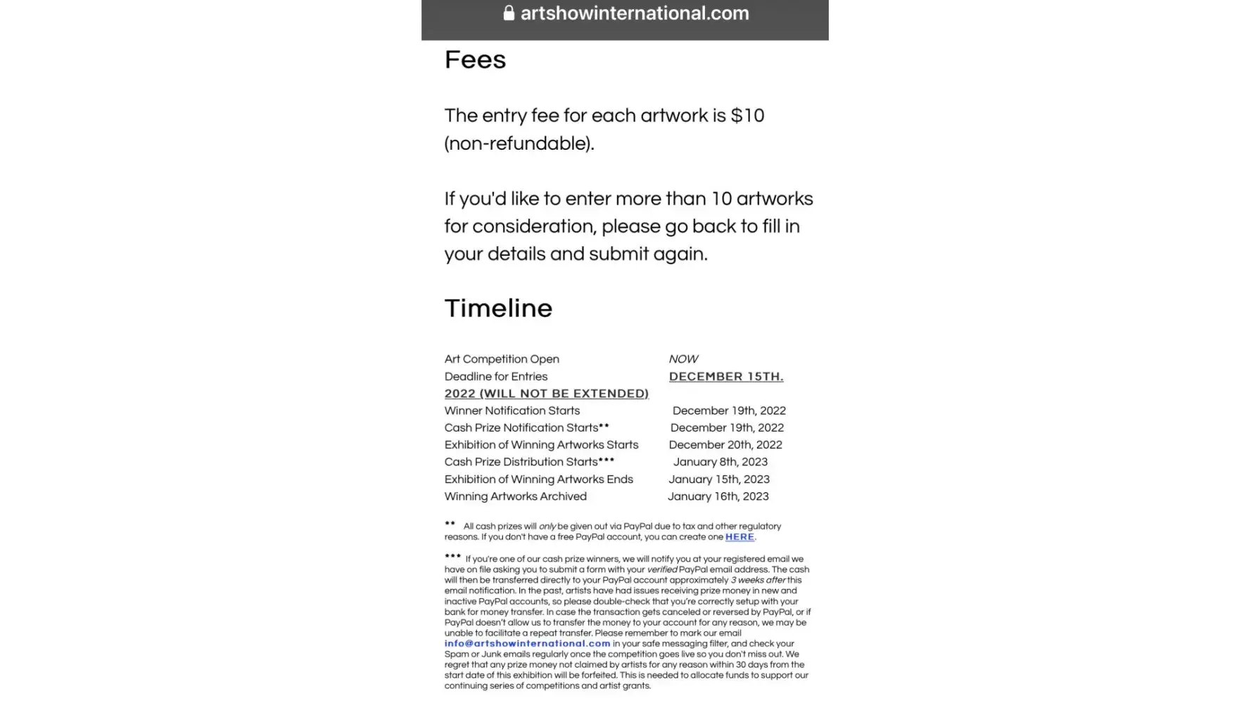 All award-winning artists, including Honorable Mentions and Finalists, will be given Certificates of Recognition. Cash prices are facilitated through PayPal, however, if you look at the disclaimer, which is a screenshot below, it says that there is a possibility that there may be some refusal by PayPal to honor it, and other problems with PayPal, which would leave winning artist with no monetary awards.