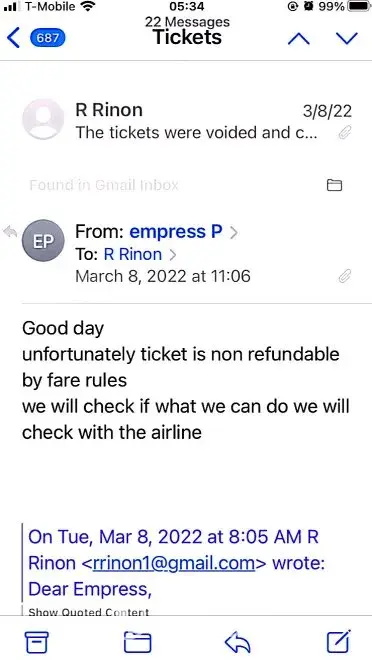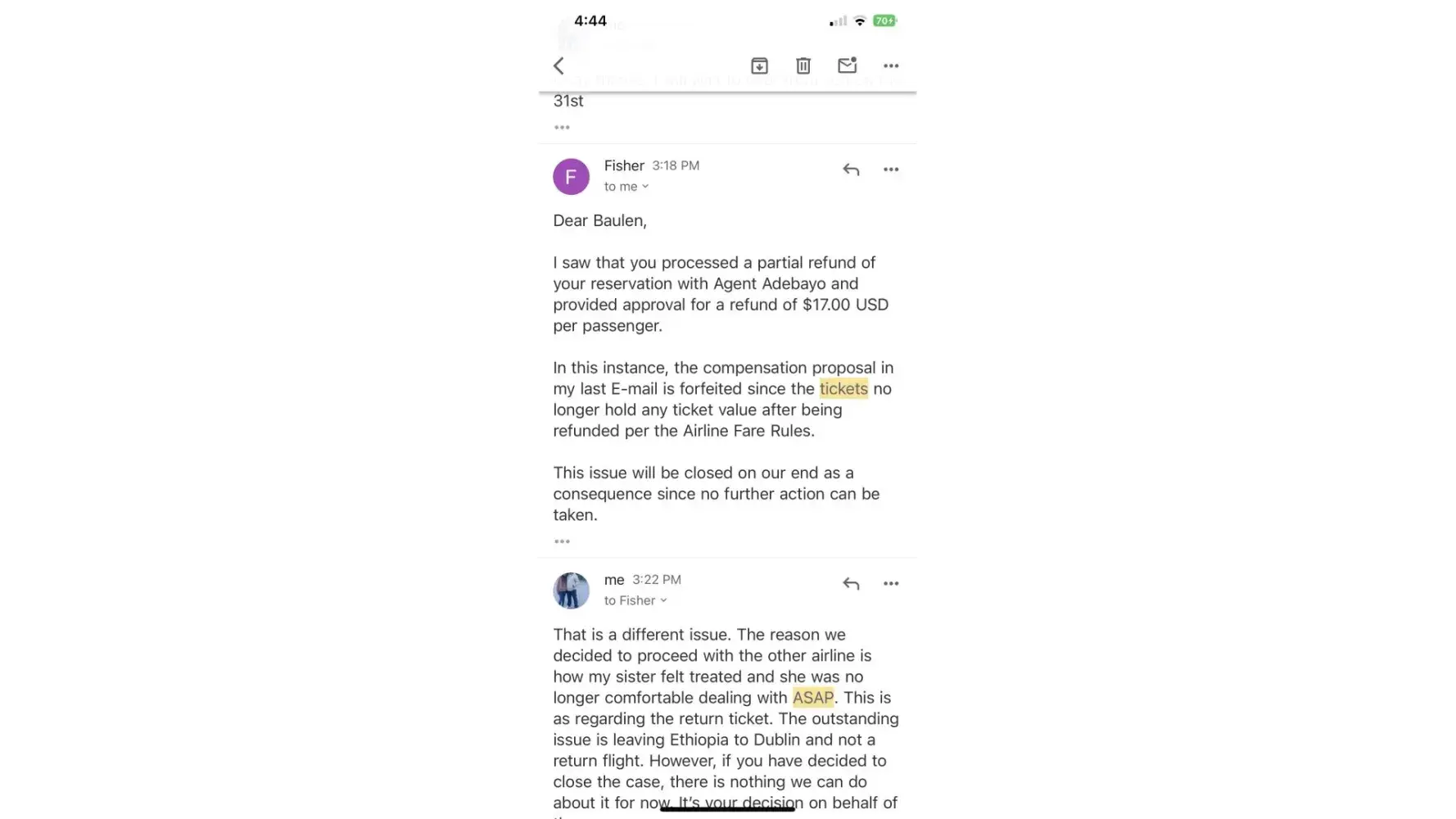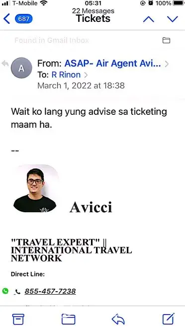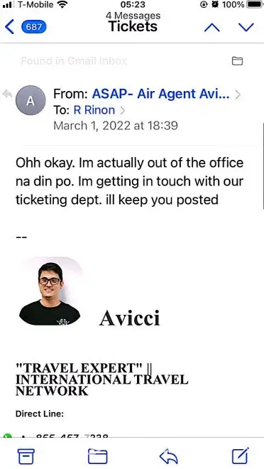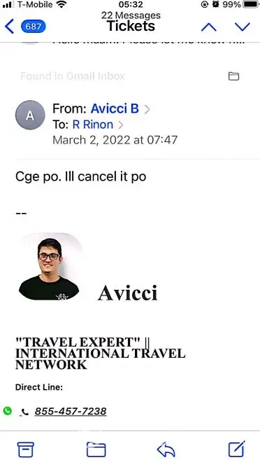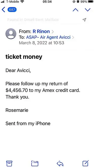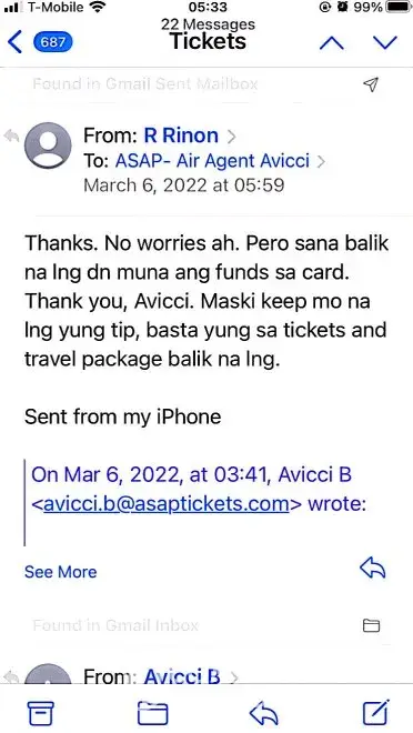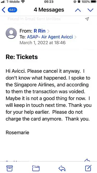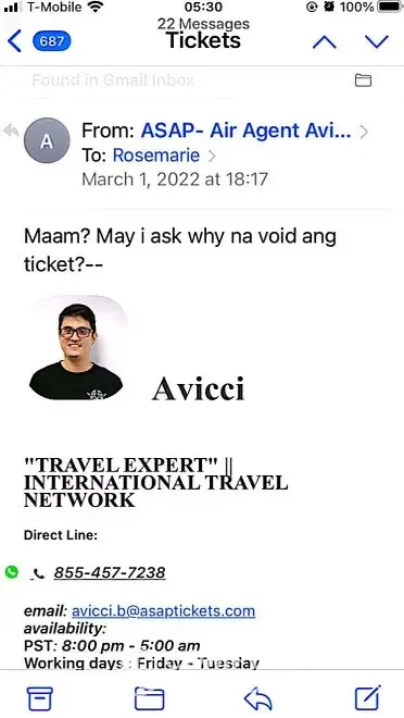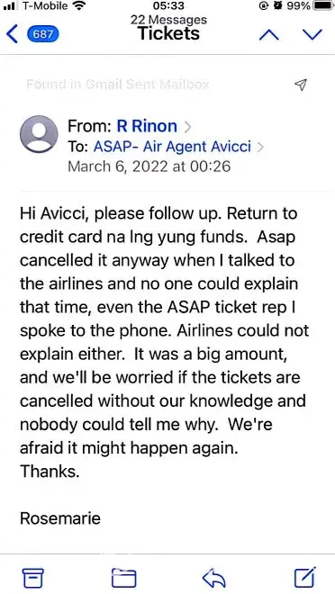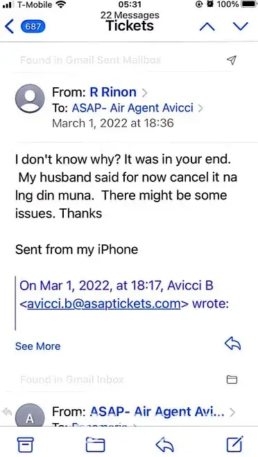 617-648pm email convos w/Avicci->told him it was ASAP who voided tkts per SA, consistently told him KEEP tkts CANCELLED; I do not want it anymore (i was scared of the inconsistency in ASAP and no one helped if agent Avicci was not around)