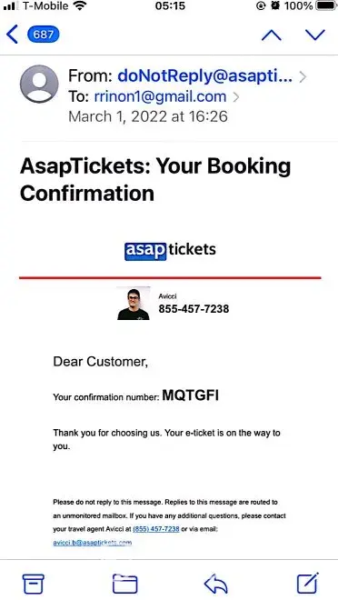 On 3/21/22 AsapTickets emailed Travel Care Services confirmation no. 2814505 (attached)
