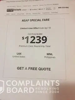 Last April 18, 2018 to tried to find a round trip flight departing at LAX to Manila, Philippines. I followed the required information by asaptickets.com by indicating may name, email address, phone number, date departing and the return flight including premium economy seat. Then, I selected the Airline of my preference which is Cathay Pacific. Selecting the box of Cathay where the best deal will be selected, the desktop screen changed if site is looking for the best deal. Few Second after, a price appeared in the amount of $1, 239.00 of which the offer is limited to end by April 18, 2018.