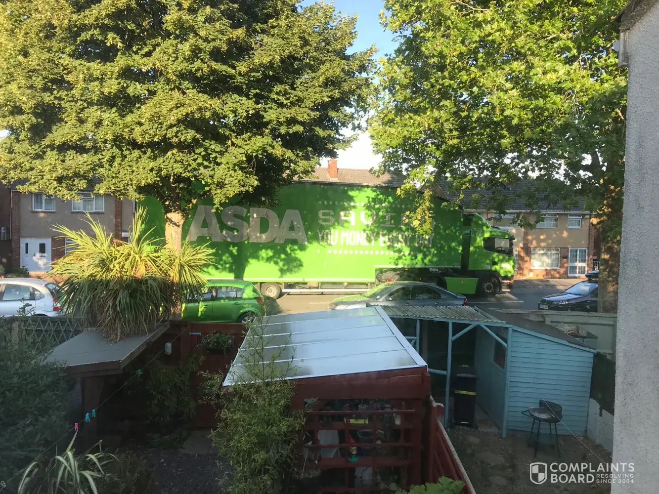 I am writing to complain about your HGV delivery vehicles passing our house on a regular basis, our bedroom windows are feet from the main road and we are disturbed constantly day and night and due to the size also blocks out the available light, I have attached a photograph as proof. We do not understand why they use this route as it is not the shortest road to and from the main link road, in fact it is the longest, I do not know if the drivers are using a satnav but it must be obviously wrong, I am happy to invite any of your managers to sit in out garden or bedroom and witness the issue themselves, its has become very noisy due to this, no other delivery vehicles use this route, why then ASDA? plus with this hot weather we need to have out windows open and this obviously makes matter worse. I look forward to your reply, better still, please re-route your HGV's, our postcode is BS140RQ you can see the issue concerning the road closeness on Google Earth, this was a quiet road until your trucks spoilt it.