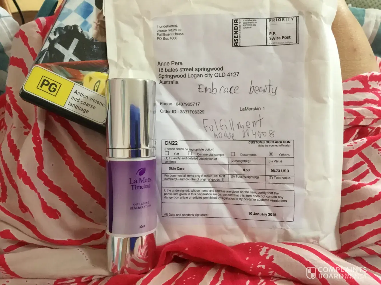 I bought a free sample from this company, paying only for the cost of posting...but They have started to send me beauty products very month that I have not requested and are charging my credit card... I wish this to stop immediatly and to have the refund deposited back into my account...there is no contact number or clear address or company name... no invoice ...the product is .. la mers timeless anti aging regeneration, order ID 3337FO6329... asendia sin 004008...fulfillment house po box 4008...98.73 USD... thank you for any help, Anne Pera ...email [protected]@bigpond.com