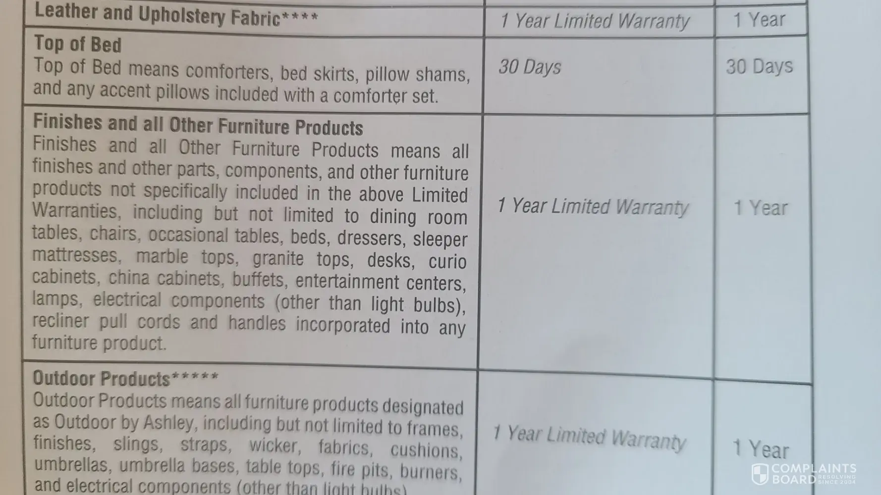 I purchased a pair of end tables for my living room, through a company called Cymax. Basically they're a middle man that sells Ashley furniture, along with others. They have a very clear policy that if something is damaged in shipping, they honor it and fix the situation. However of the actual furniture is damaged or inferior, Ashley has a 1 year warranty.