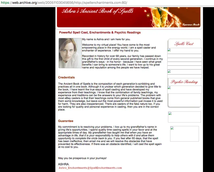 20 odd years later, she is still scamming people. Like I said, I don't disbelieve in spells and psychics and tarot and the like. I think it's fascinating, but she raises too many red flags. She has too many on her side.