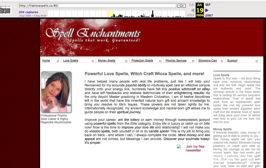 freelovespells.ca (she owns the domain, it is now attached to:  https://www.passion-panacea.com/,