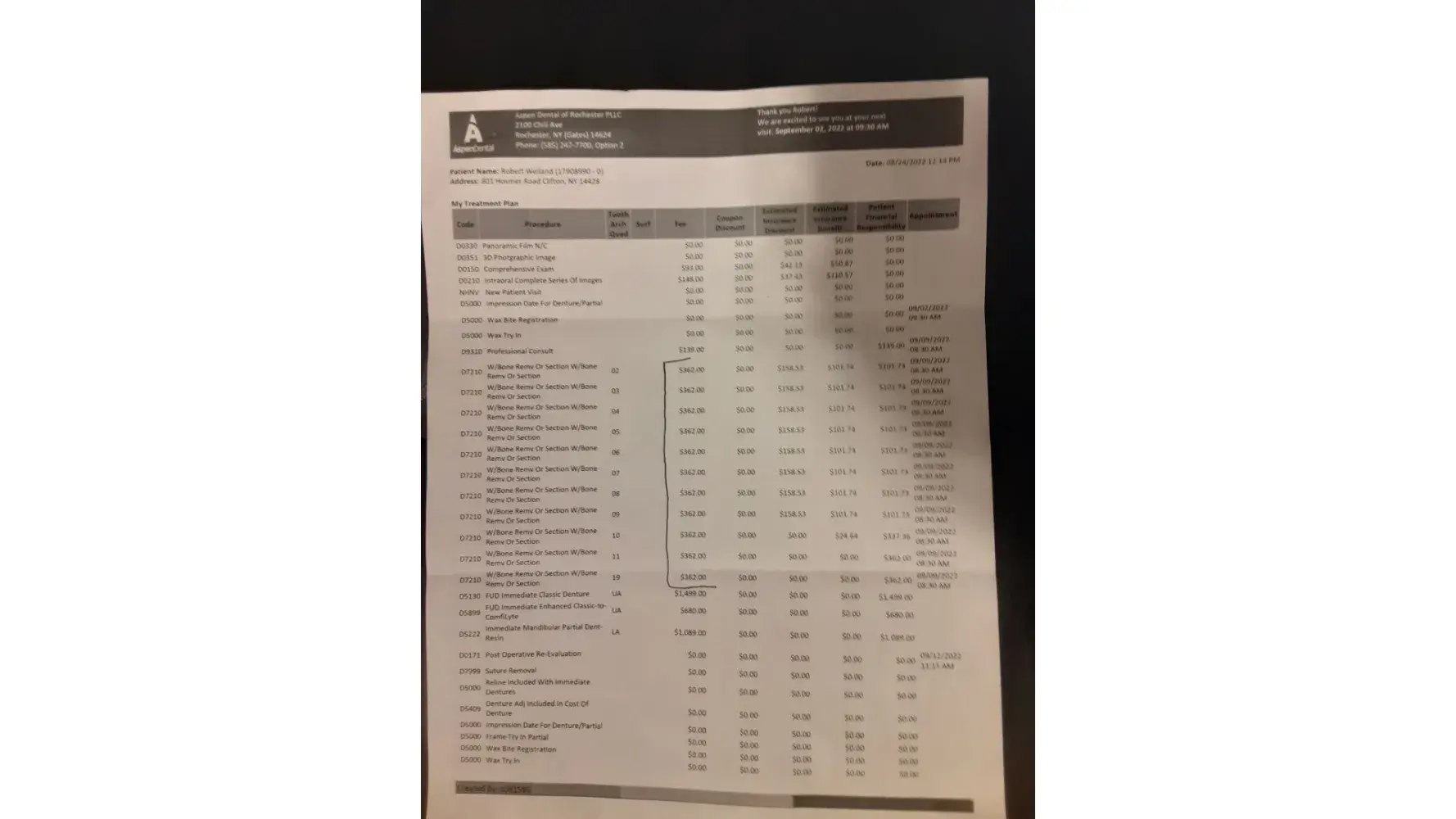 I had purchased a complete upper denture and a partial lower one on 08/24/2022. I had to have 11 teeth extracted. The charge per tooth was $362.00 each making the extractions total $3,982.00