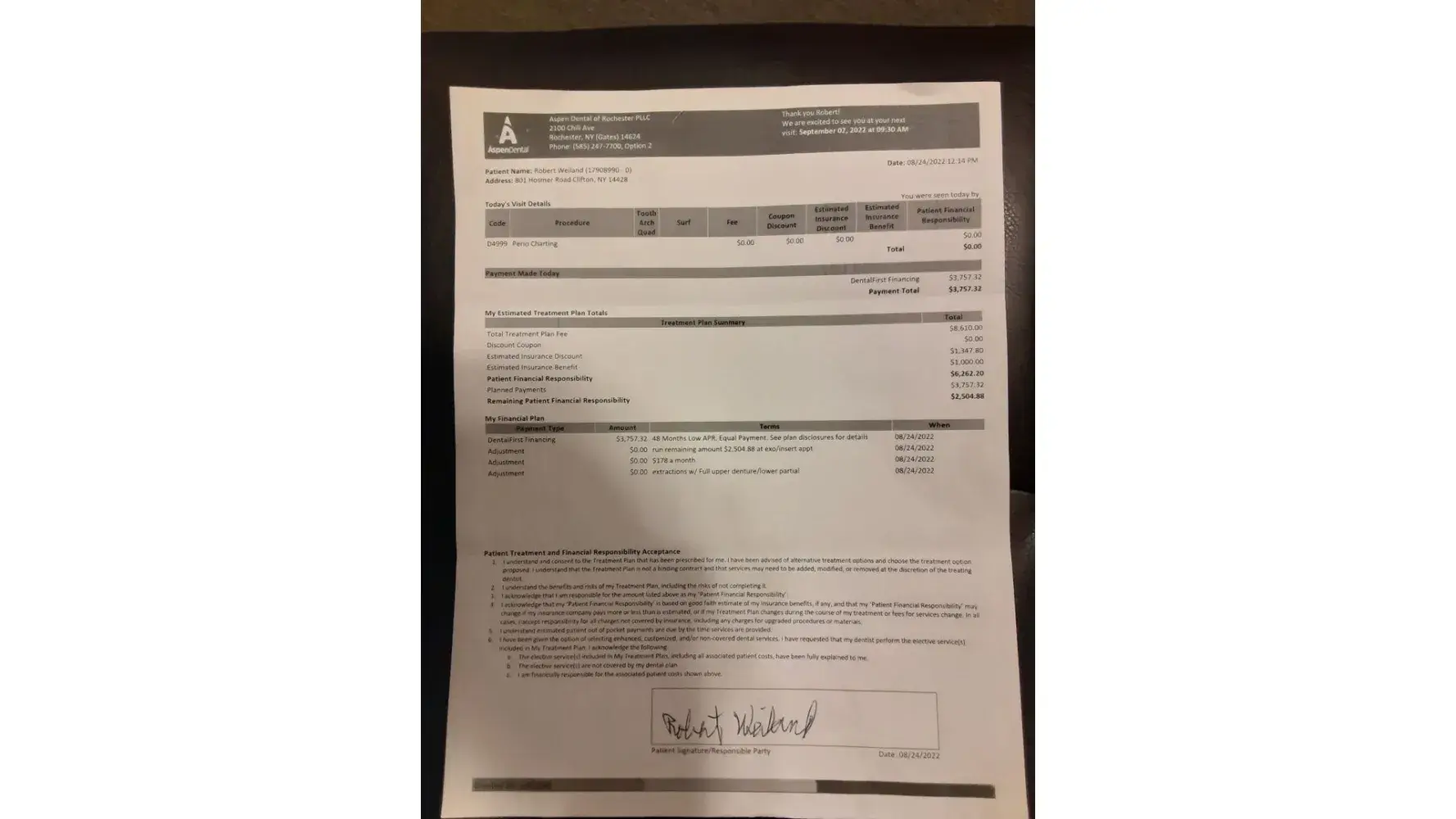Aspen dental center. The work was done up to and including the extractions and placement of the "temporary" dentures (upper and lower). We were told we were required to pay the remainder of the bill at that time ($3462.00). The final payment was made thru Care Credit. The treatment plan coordinator was Daniel Frilhauf.