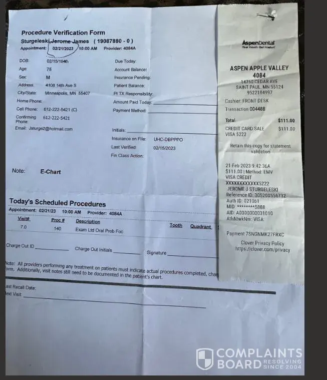 On feb 21 I was charged $111 for a dental evaluation I submitted the claim to my medicare supplemental and they paid $51 i, ve been trying for several months to get a refund but I just get put off, I had procedure done in n apple valley mn and was referred to the hastings office for collection the number ive been in communication with is [protected].