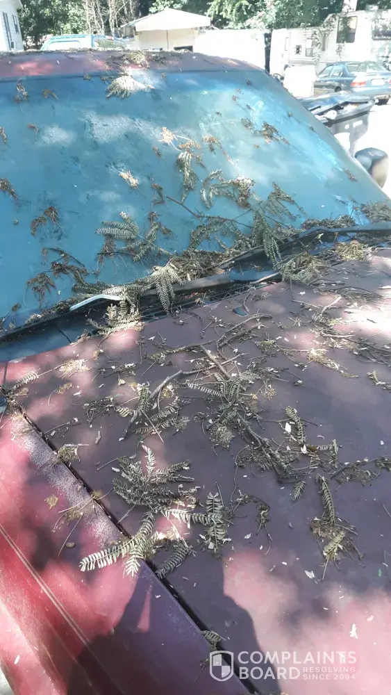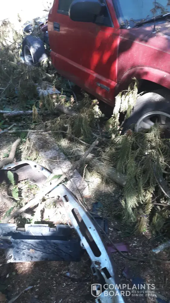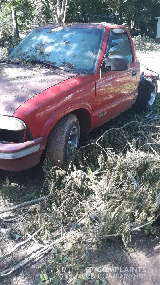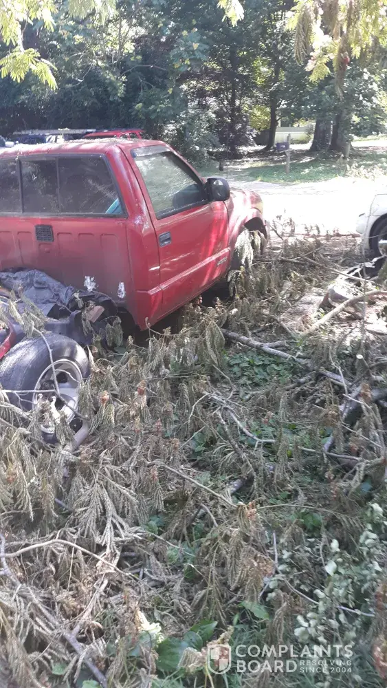 I have my vehical at a mechanic's garage I'm China grove north Carolina. Asplunde was doing tree trimming on my mechanics power lines and they dropped limbs and debris on my truck. And left debris all over my mechanics yard . I want to know why my truck has debris all over it and what can we do to solve the issues at hand. I have photos of my truck and all the debris