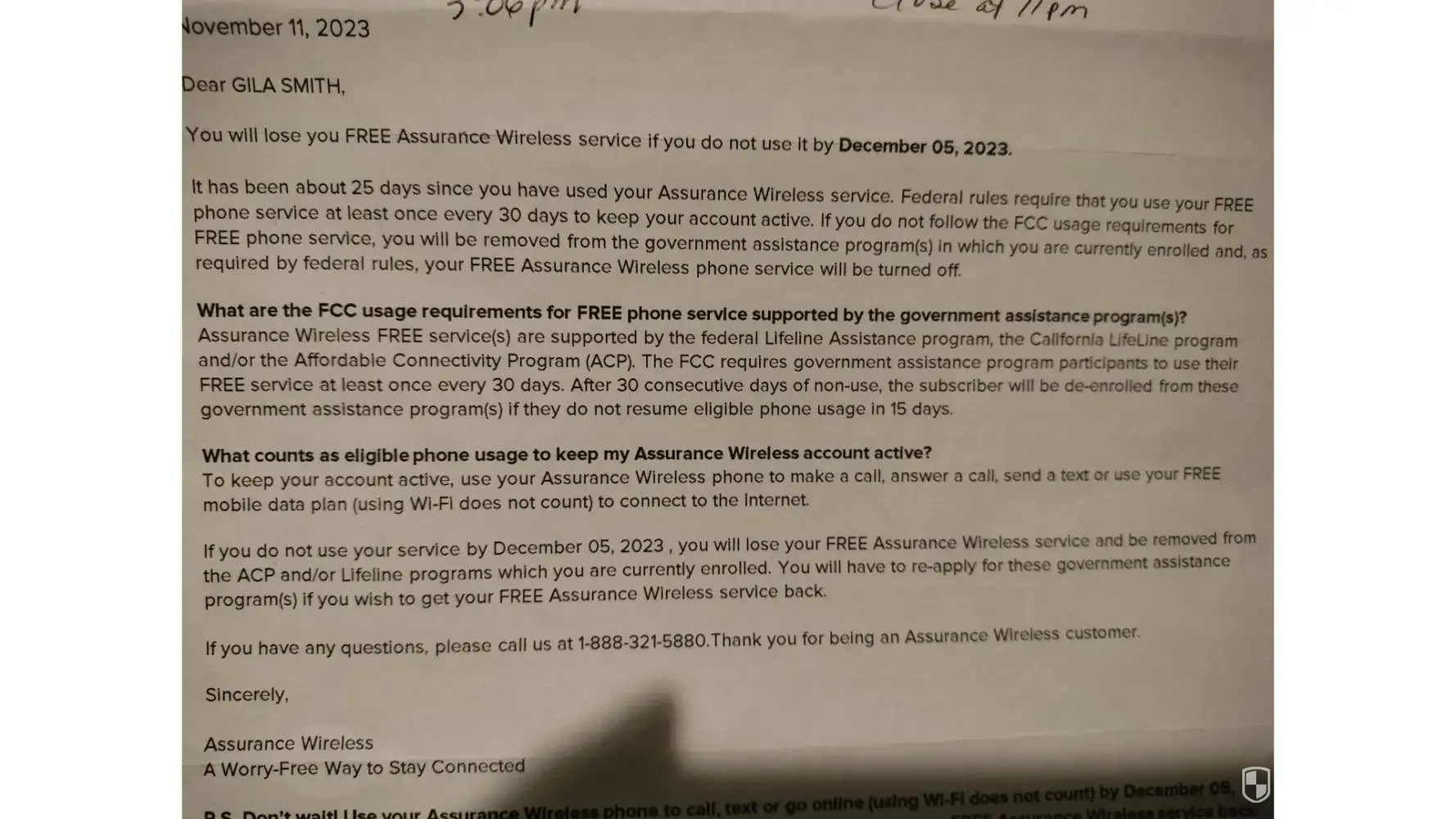 4. While waiting on a working replacement, I received 2 letters from Assurance. One stated that if the phone is not used by Dec. 5, 2023, service would end. How can I use a phone I do not have? The next letter on Nov. 20, 2023 stated that unfortunately, they were unable to fulfill my request for service because they were unable to enroll me in the Affordable Connectivity Program. If I was still interested in the Program, I would have to call the number or go online to their website.