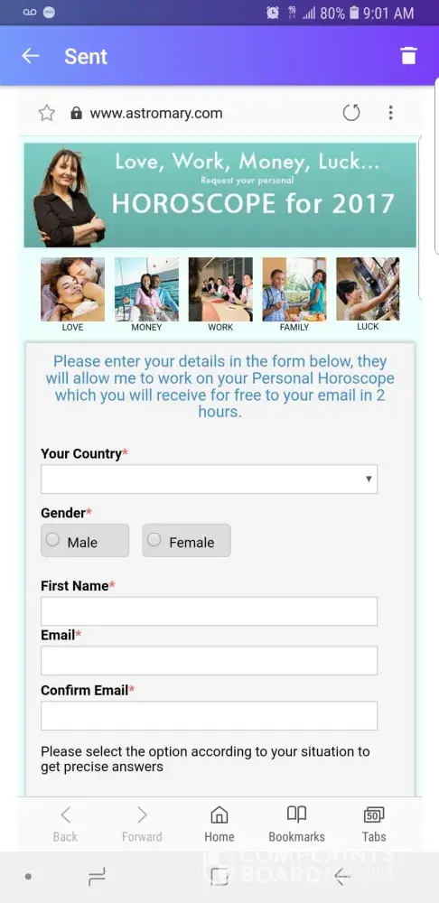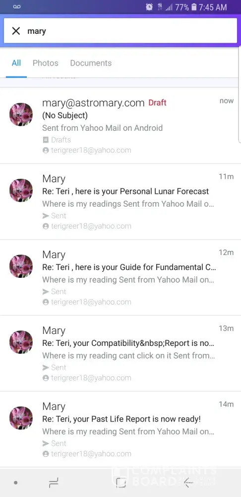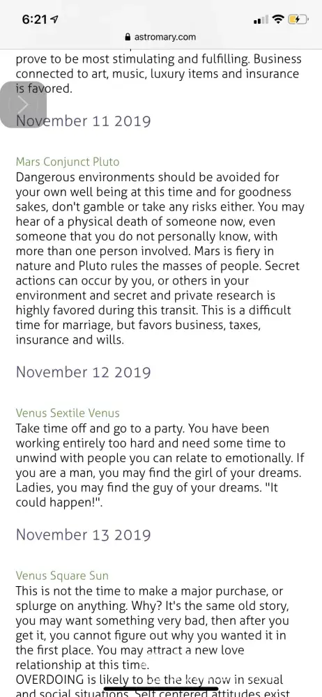 About a month ago I purchased the reading from astromary.com. I read it almost everyday. Some things don't match up but no ones always right. So anyway I start getting an email saying she wanted to look into my past life and I had great fortune coming. As I was very hesitant about purchasing the extra reading I purchased it anyway hoping for luck to turn around. Only to open the "reading" for it only to be till me how I need to start thinking and acting. It's nothing of how I am at all but then there's another day by day forecast. And as I'm reading over it I noticed that there is the same exact forecast but on 2 total different days. Then comparing the days side by side on now 2 daily forecast there totally different on the same dates. This is a scam straight up!