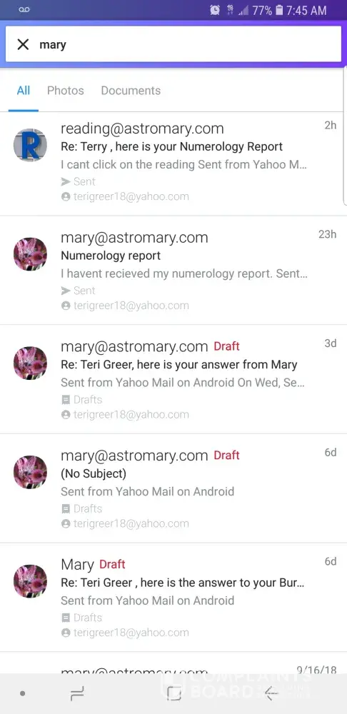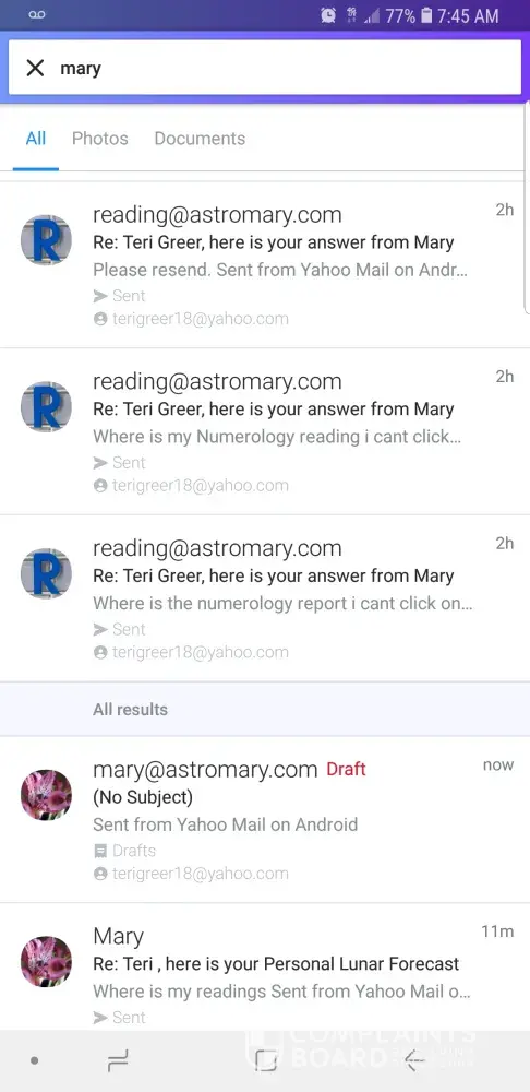 Mary began emailing me, O can only figure from getting info from another site. At first nothing was accurate and then she made a claim that something had occurred around the age of 16 or 17. I realize that probably could have been anyone. So I paid the 59 American dollars. The refund policy is 14 days no questions asked. My payment to Mary was on the 26 August 2019. It wasn't until the 29 August that I received my report. It was so inaccurate. That I immediately sent an email stating as much. She asked me to take my time and review. There was absolutely nothing in the report I could identify with. Then on September 5, Mary sent another advertisement requestimg more money. Since I.was still unhappy with the original I then realized it was all a scam and requested a refund through the appropriate email. Today is the 21 September and as of now, not a single response. I sent an email informing both email addresses I would file a dispute through my bank. Still no response.