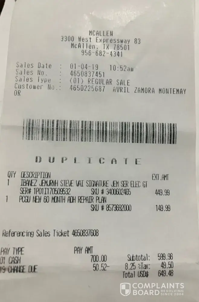 Electric Guitar acquired at Guitar Center- The claim proceed, but the check never arrived