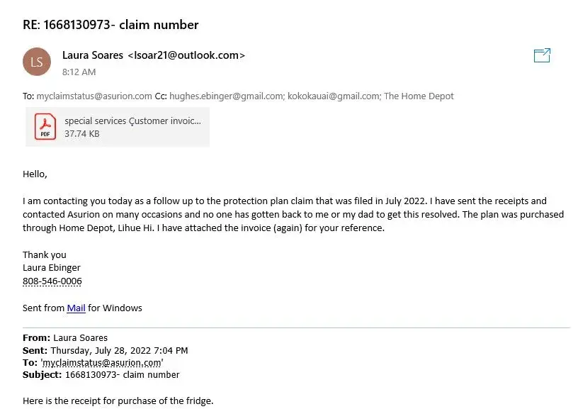 Per the request of Asurion, I have emailed and uploaded the purchase receipts and contacted Asurion on many occasions and no one has gotten back to me or my dad to get this resolved and my dad cannot afford to purchase a new fridge.