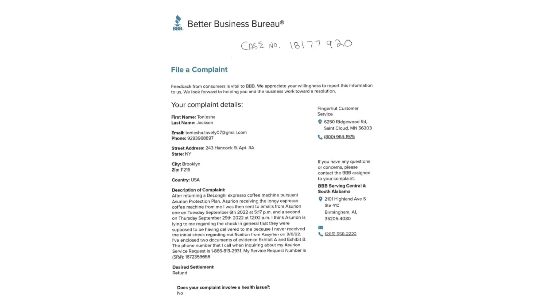 After I returned a broken DeLonghi espresso coffee machine pursuant to my Asurion protection plan I never received my refund for $179.99. After Asurion received the broken DeLonghi expresso coffee machine from me through a UPS return from me I was then sent two emails from Asurion one on Tuesday, September 6th, 2022 at 5:17 p.m. and a second email on Thursday, September 29th at 12:02 a.m. Asurion is lying to me regarding sending me a refund check for $179.99 that they were supposed to be having delivered to me because I never received the initial check or the second check promised to me. I spoke to an Asurion agent named Ms. Lady on October 6, 2022, who promised I would receive a refund in the mail for $179.99 no later than October the 12th, 2022 to no avail. I've enclosed 9 pages and one audio recording of documentary evidence regarding the consumer fraud towards me. The phone number that I called to inquire about my Asurion service request and refund is: [protected] and my service request number is (Sr#) [protected]. The Asurion Corporate Office Headquarters address is 648 Grassmere Park Nashville Tennessee 37211. The Asurion Headquarters Corporate Office phone number is [protected], [protected], or [protected]. Because Asurion refuses to fulfill their service agreement obligation by giving me my refund of $179.99 this is a breach of contract and I feel consumer fraud.