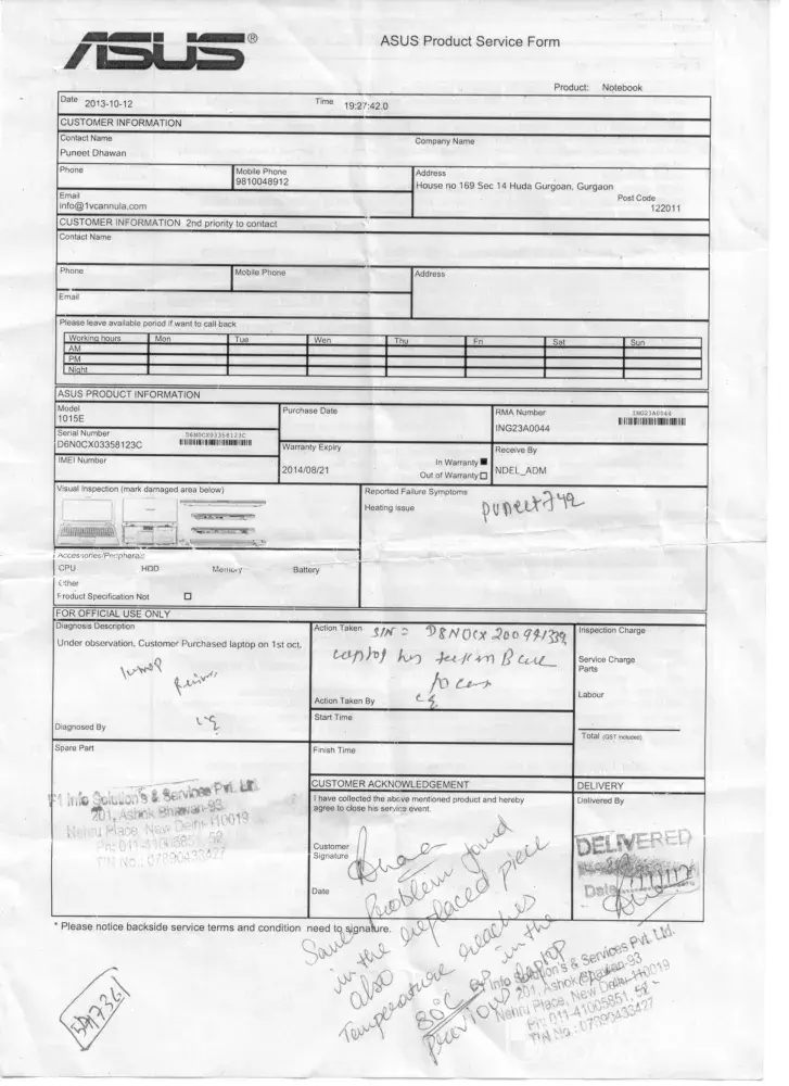 On 01/10/2013, I had bought asus netbook pc as 1015 which had a cpu heating issue the complaint was logged on 12/10/2013 and after much effort and persuasion I was given a replacement on 01/11/13 (a good 20 days were taken for the resolution). to my surprise the replacement also had the same issue of heating and the same was informed to the service engineer at the time of receiving the replacement and was noted in the receipt too.