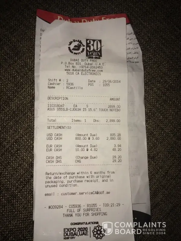 I am contacting in regards to a laptop my father bought for me in 29/06/2014 from dubai duty free. I have sent a few emails before but it seems that they have either not been responded to or not gone through.