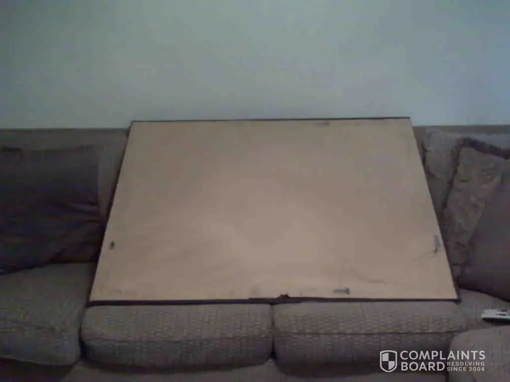 I recently purchased a mirror and some other art work to hang in my new home. It has been within the last 6 months. One of the pieces I purchased is a heavy 4'X3' mirror to hang over my sectional. I followed all instructions and hung the mirror with the proper hangers that hold over 200 lbs of weight. I found a short screw on my sectional about a week ago and questioned my children about it. No one knew where it had come from. I was sitting on my sectional today when I heard a noise and turned my head to see the mirror crashing down. I was able to somewhat break the fall and keep the mirror on the sectional where it did not hit the floor or glass table and break. However a bit of the front chipped off during the fall. The part on the mirror that has 4 short screws holding in the part that is used to hang the mirror was bent and had pulled out of the frame. There were 3 screws left and the 4th screw was missing and matched the one I found on the sectional a week ago. Bits of the frame were stuck in between the screws and had pulled completely out of the frame. (see attached pictures)