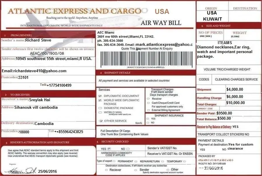 Me also really same story above, i have met a foreigner in blossoms.Com, he is the one who first messaged me, he said he is an us air force, but he told me that i will reply directly in his email add (dgoldfarb616yahoo.Com) because he will is not online always with that site due to the nature of his work, and then after that we always messaging each other, then he want me to be his wife, and then one day he ask of my birth, about my family background, and then i told him the truth, i told him that we are not rich, i have told him lots of me, but then sudden he said that he want my complete name and address because he want to send a parcel, and then he told me he already sent it thru qatar cargo company, but there is a remarks of atlantic express and cargo he sent me the picture of the airwaybill, but it has no tracking number, he said he dont allowed it to put on the tracking due to the security purpose, he said he sent me . Apple laptop, sonybravia 40 inch, iphone 6 plus, saudi gold 24k, wristwatches swiss made, and he also fix inside the box the 18, 500$, of course he didnt notify the courrier that he fix inside box the money, he also provide me the pin code of the brief case where he put the money, he also sent me pictures of all items he sent, i really really believe him, because i never ask about him for that, i told him also that we are not rich, he also told there that it will arrived in me in just 2-3 days, but then of course i asked here in my place to those already received packages from another country, they said that it will arrived for a month or two .. But then he said it was rush because it was speed post, ,