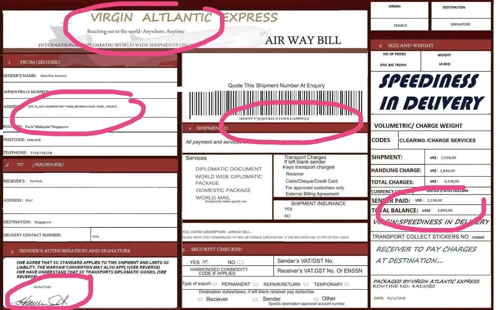 I am frm Singapore & it hppned the same thing. Scammer contacted my 50 y/o mum via Facebook addressing himself as Abdullah Kareem, Malaysian citizen, staying in Paris & he's looking for a wife. Knwing for a few days, scammer show his "love" affection by sending parcel with branded bags/shoes/bags with an invoice stated a total balance of SGD2500 tht we had to pay. 1st, noticing there isn't any TRACKING NUMBER, it's obviously FAKE. 2nd, we googled the address frm the sender, it's a PASTRY SHOP! Haha! 3rd, serial number (barcode) and signature on the invoice is the same as wht you can find in google.