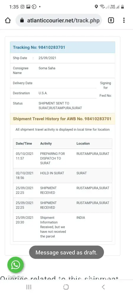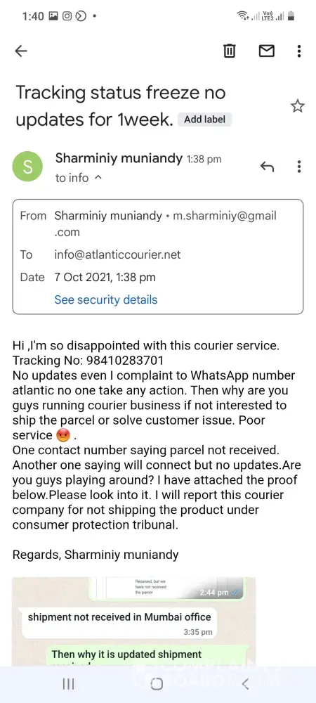 I am complaining about my package which was sent on 15/10/2021