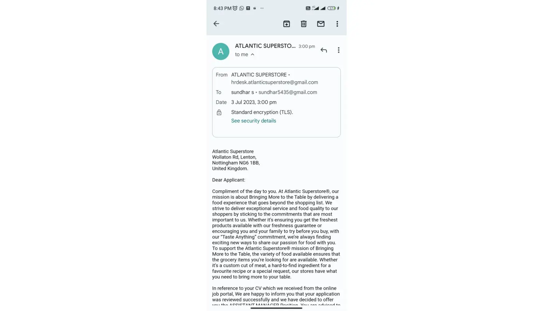 I had got an offer letter from atlantic superstore through mail, l need to know, weather it's from your side (or) not