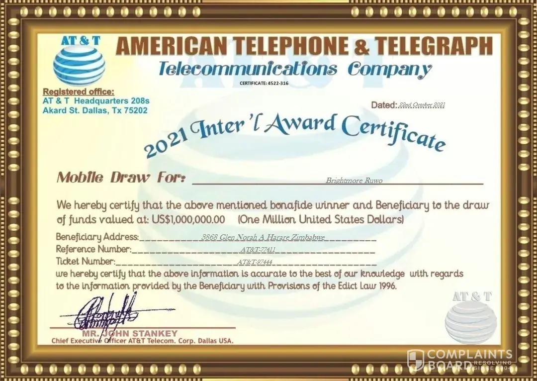 Hello sir. I'm Brightmore Ruwo from Harare Zimbabwe. I was issued a Certificate award by AT&T Telecommunication Company Conforming me as the winner of the award which is worthy 1 million US Dollars. The money was temporarily deposited in Lloyds Bank account for further transaction to my account after providing documents required by Lloyds Bank whi ch include the affidavit of claims Authorization Certificate from the Supreme Court of United States. Then Mr John Stankey CEO of AT&T refered me to Alban Chambers seeking for Assistance to obtain the last document from Supreme court.