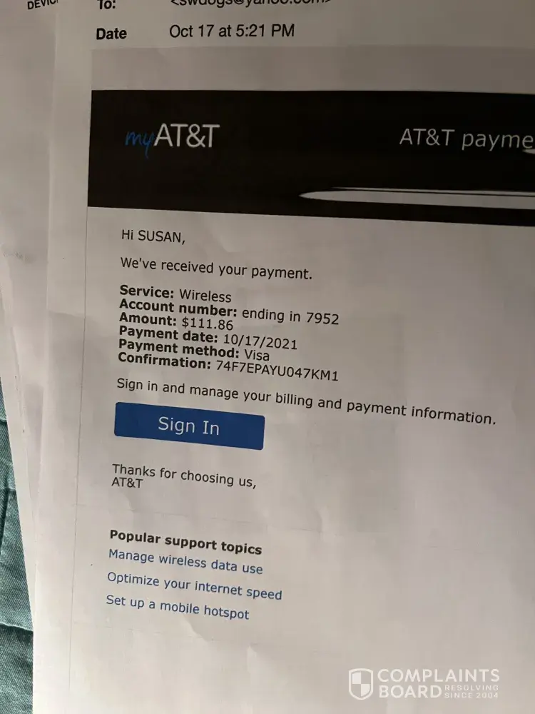 My daughter (Kayla hobbins) started this account. She shortly after moved to Florida. I (her father) just kept up with the payments (because changing the account to my name was a real hassle), now that I moved myself I had to canceled this account. I told the customer support rep. to cancel this account on August 31 2021. She told me that my billing period went to the 16th of Sept. I said no cancel it on the 31st of August. The next day Sept. 1st I sent back all your equipment with UPS. I thought that was that but I got a bill for $54.45 because the service rep. I talked to DIDN'T cancel my service liked I asked her to. so I was charged till the 16th of Sept even though I didn't have any of the equipment. I tried calling 4 times to resolve this dispute but I don't know my daughters pin or secret answer, and I cant get a hold of her. They let me cancel it but wont let me explain whats going on, I have been hung up on and after 1/2 hour explain was told "I cant do anything about it" because they needed the pin or secret question. you had no problem talking my money but now hassle me all because one of your Customer Support Reps. didn't do as I asked (cancel this account on the 31st). This is my last attempt to resolve this with AT&T otherwise I will file complains with the BBB, and maybe with the consumer protection. Why would I send I the equipment in if I was planning on using it till Sept 16 (the end of my billing cycle)