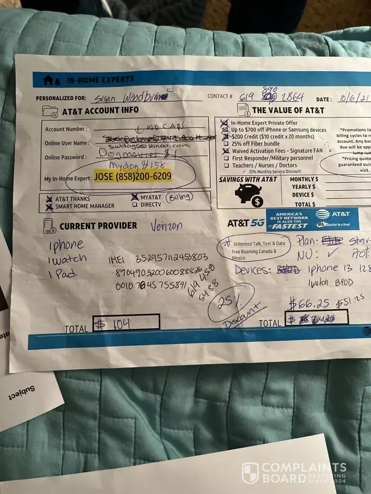 Salesman came to my house gave me written cost for new service. Lied. No one cares. Not customer service nor salesman nor chat nor ATT STORE. Now getting notice that my fam plan discounts ending. Did not have and only wit ATT LESS THAN a month. GOING TO DROP AND GO WITH T-MOBILE. BETTER price. Will pay off phone and much better customer service than ATT