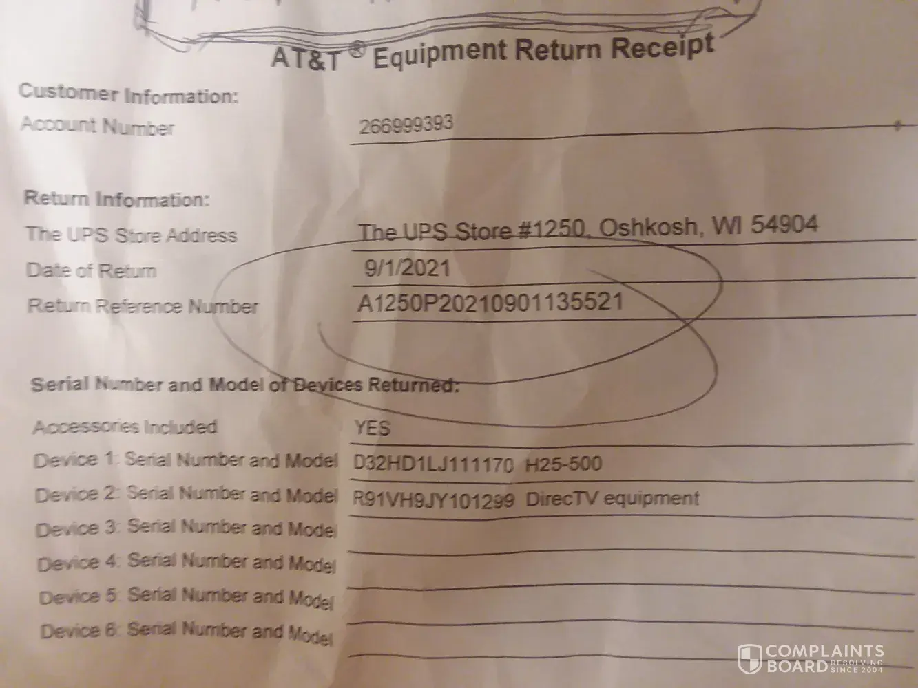 Cancelled service in June, shipping boxes/labels promised. Never arrived. Threats of monetary fines thrown my way. 6 phone calls promising labels did not help. Charged $337 to my credit card. I disputed. They threatened additional charges. Forced me to travel 125 miles to UPS shipping center. I have the "equipment received" email, but the charge is still on my card. AT&T customer service is non-existant.