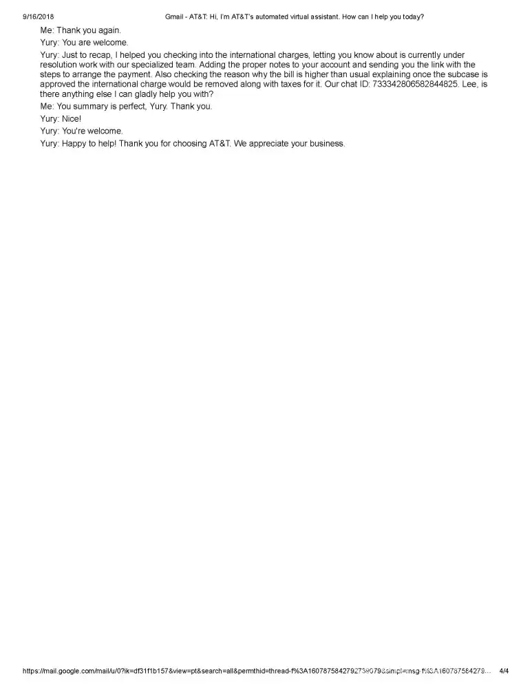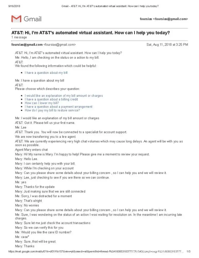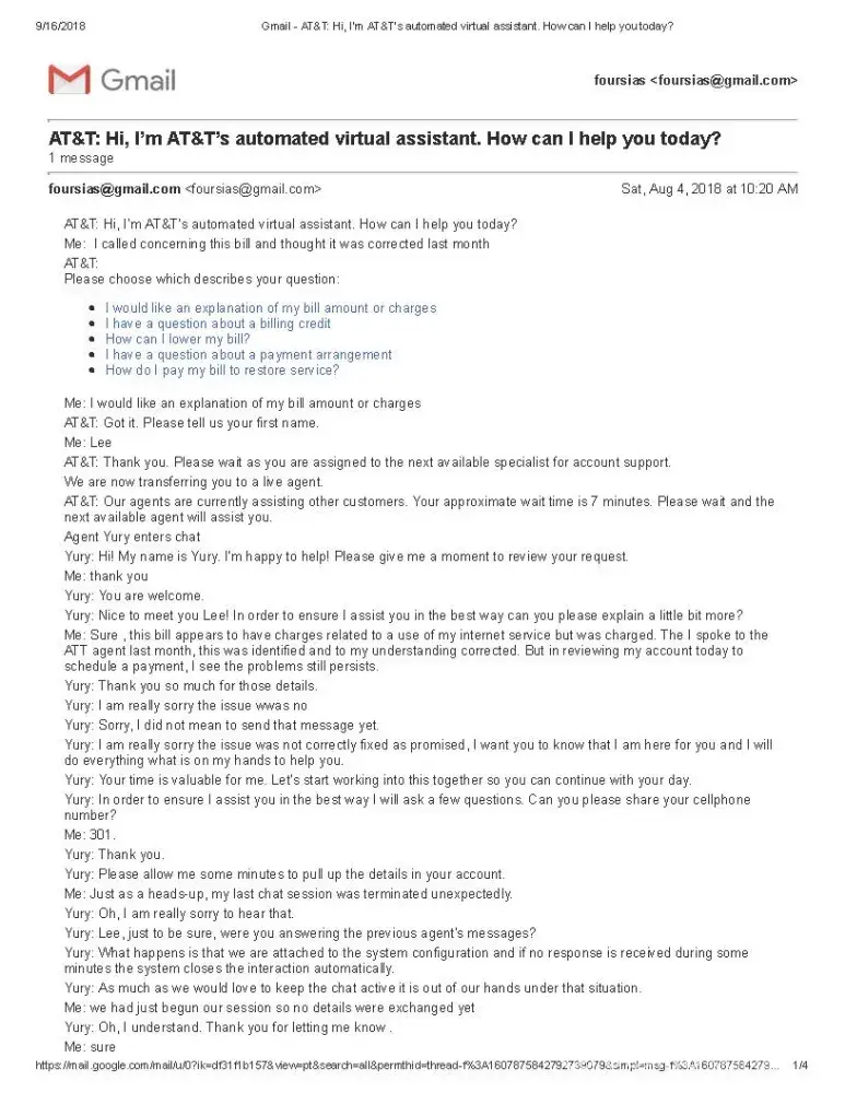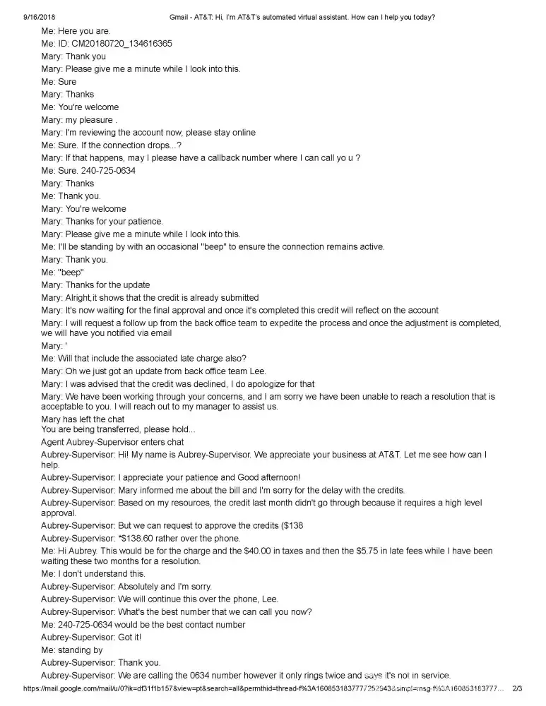 July's bill was paid minus the (errant amount) as I awaited resolution to overcharge issue. I placed a call in Late July with no resolution and again on August 4th where I was hung up on by an overseas ATT&T representative. I immediately began a chat session (attached) with Yury where I was assured this would be resolved and in good faith scheduled a payment 16 days out in order to cancel when the issue was resolved and schedule a normal payment. Following up August 11th on the status a week later, I called and was again disconnected and again established a chat session (attached) with AT&T representative Mary (overseas rep). I could not hear Mary at first because of the loud conversations and sports gaming (Like bets being placed) noise in her background. Eventually we were able to speak and I was informed first it was approved then it was declined and Mary excused herself and transferred me to her supervisor Aubrey which had the same loud background noise. Aubrey reviewed the history and noted that the request needed a higher level of approval and asked for a number to call me directly. I gave her my LAN line number but she was unable to get through so I gave her my AT&T cell number (redacted/deleted from text) and she responded that she could still not get through which was baffling. AT&T can't reach their provided AT&T number through their AT&T service? Aubrey then push the conversation over to the general customer service number which I called earlier and disconnected the chat.