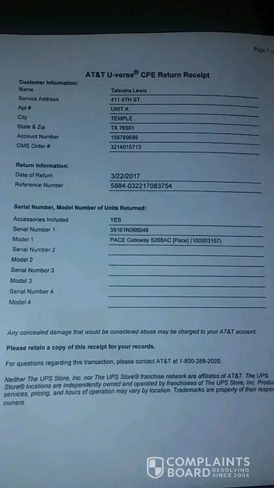 I was told numerous times on the phone and at the AT&T office where I walked the equipment in person to, that I was to ship it thru UPS and get a receipt stating return info. That once they received the equipment they would notify THE COLLECTION AGENCY and I would only pay the actual SERVICE BALANCE. I jumped thru hoops to get this stuff done.