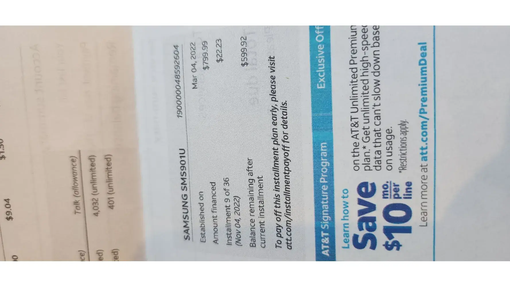 AT&T advertised free Samsung S22 phone with trade in of Samsung phone. Done on or about 3/3/22. Kept getting a monthly charge for phone. Called the company who said no phone had been returned. Found in a drawer at the store. Several calls and visits to managers resulted in no action. Told we needed to sign up unlimited plan but this was never advertised or mentioned when purchased.