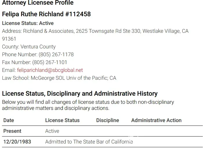 Former Beverly Hills attorney Felipa Richland was found to have lost numerous cases that resulted in a loss of many clients. Felipa Richland had to look for cheaper rent and went to Westlake Village in Ventura County. A few of the major losses include, but are not limited to, Nathan Enterprises Corp. v. Hyde Swigart, 2010 Cal. App. Unpub. LEXIS 7604...