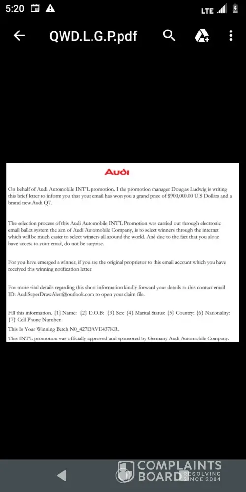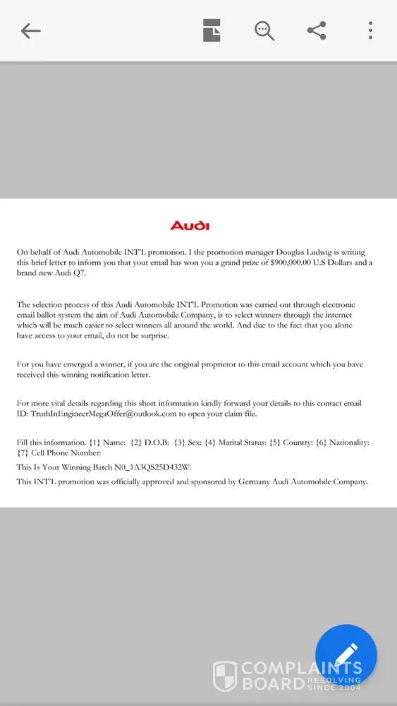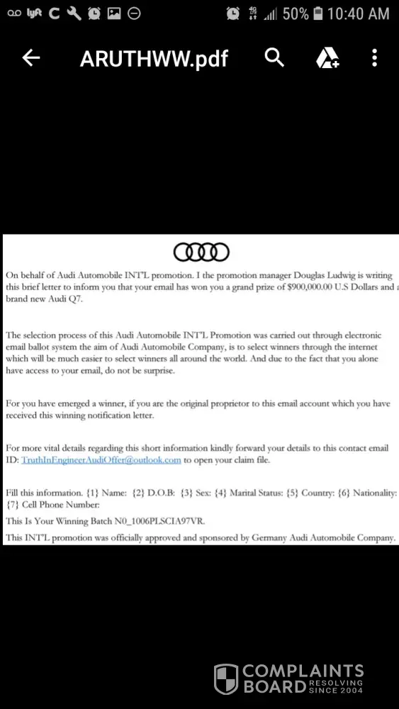 On behalf of Audi Automobile Company, I Mr. Don Morgan is writing this brief letter to inform you that your email has won you a grand prize of $900, 000.00 US Dollars and a brand new Audi Q7 2018 model.