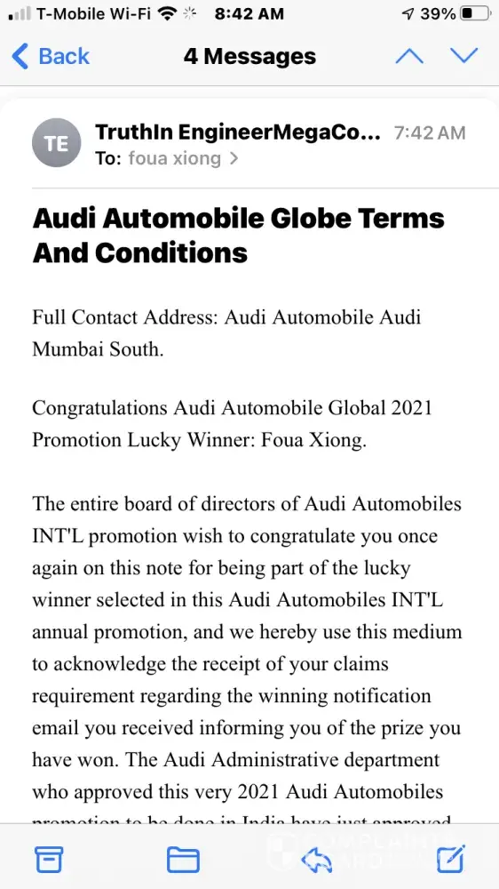 I just received an email about winning $900, 000 with an Audi 7 so they're sending that out again maybe you can write something on your website I received it on March 6 2021