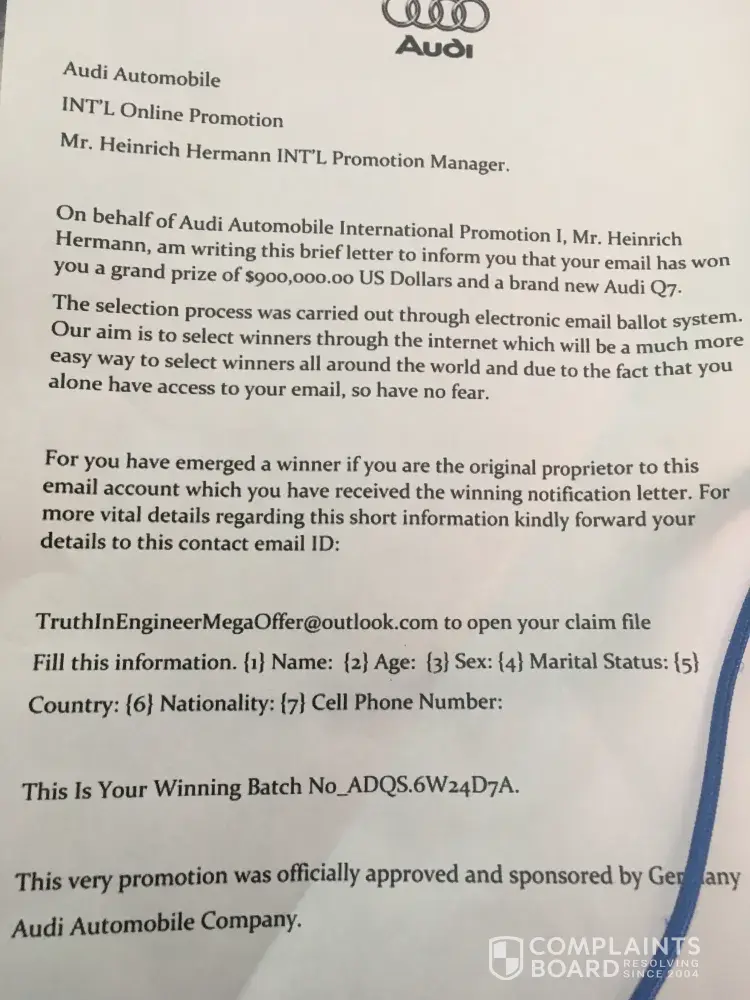 I sent a file which came from a PDF which this file look professional but not legit after I sent him informations about me about the prize ….