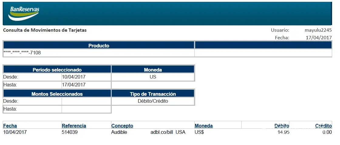 Adjunto aqui les envio el cargo a la tarjeta en el banco.