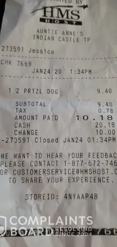 I visited Auntie Anne's at Indian Castle rest stop. Store ID 4NYAAP48. Worker was Jessica. I was there 1/24/20 at 1:34PM. I visit this place every time I am traveling & always order mini pretzel dogs. I know they have to cook them when you order so I order them 1st & then go do other things & stop back for them. I ordered 2 mini pretzel dogs, paid for them...